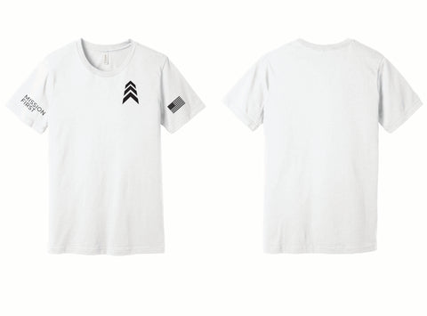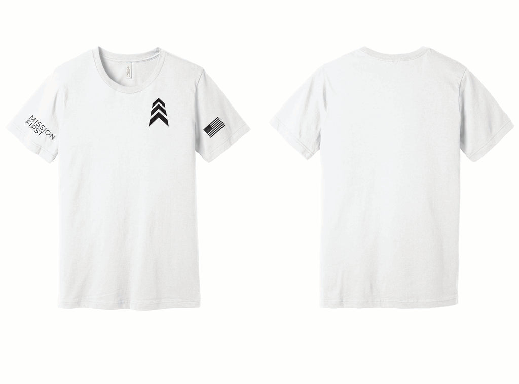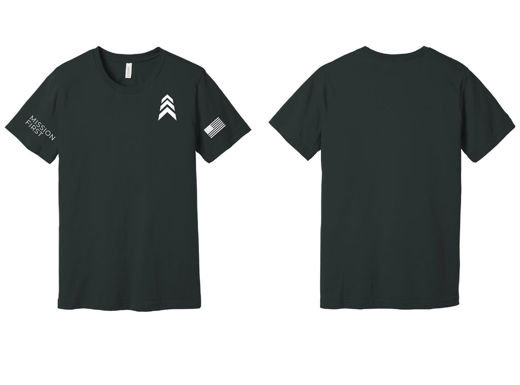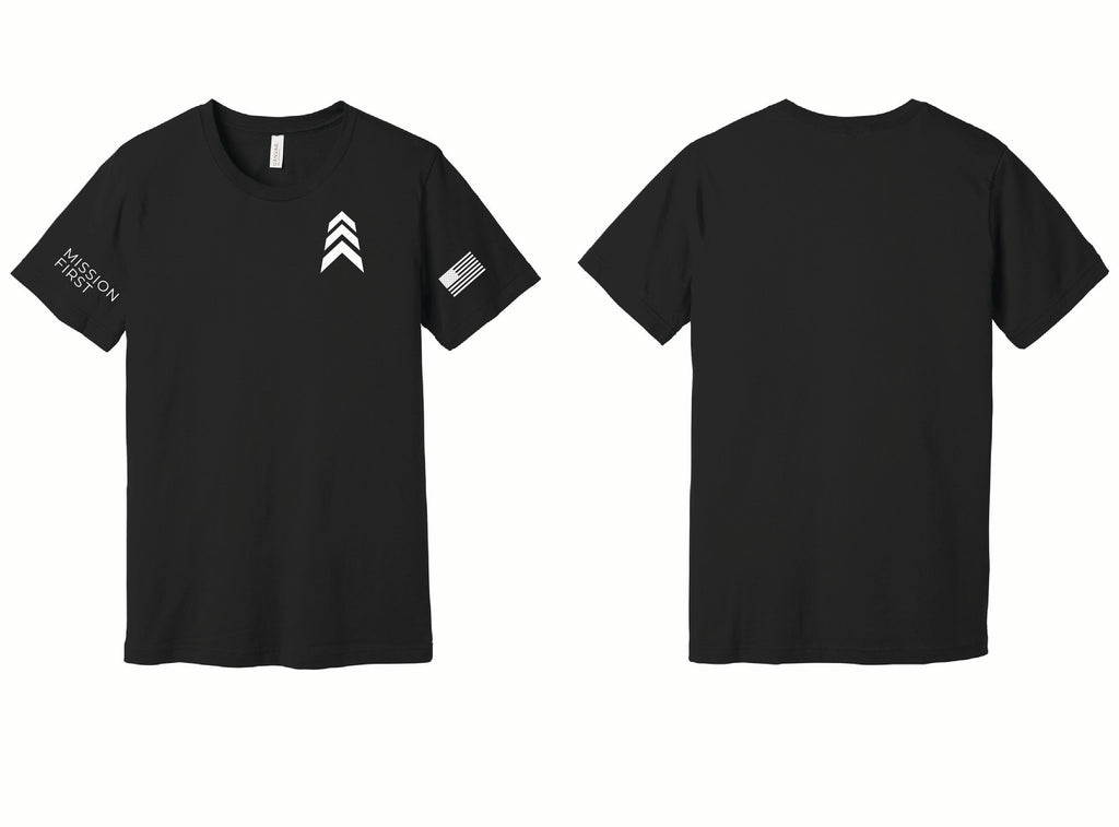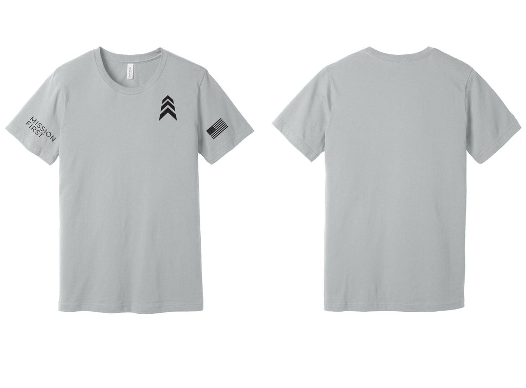 Bella-Canvas Unisex Jersey Short-Sleeve T-Shirt, featuring the Mission First chevrons on the front, American flag on the left sleeve and the Mission First text on the right sleeve. Be sure to pick the correct color AND size.